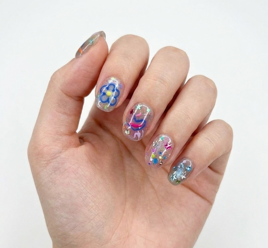 Y2K Glitter Confetti Press On Nails – Hand Painted Flower Doodle, Abstract Swirls - Harajuku Decora Funky Gel - Custom Size Set - PN251179