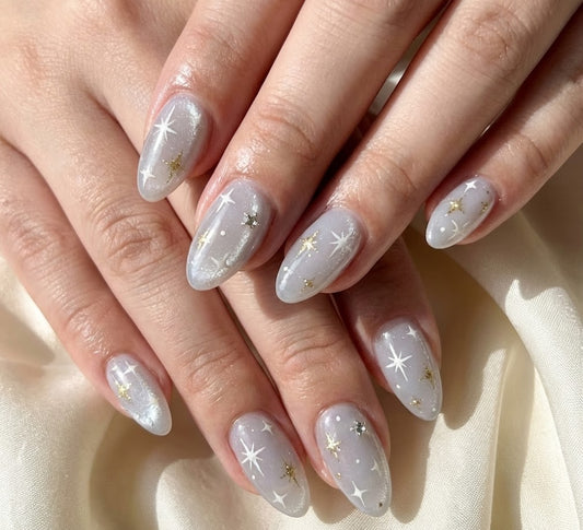Silver Cat Eye Star Press On Nails - White Gold Celestial Art - Velvet Magnetic Shimmer - Dreamy Sparkle - Custom Size Set - PN251193