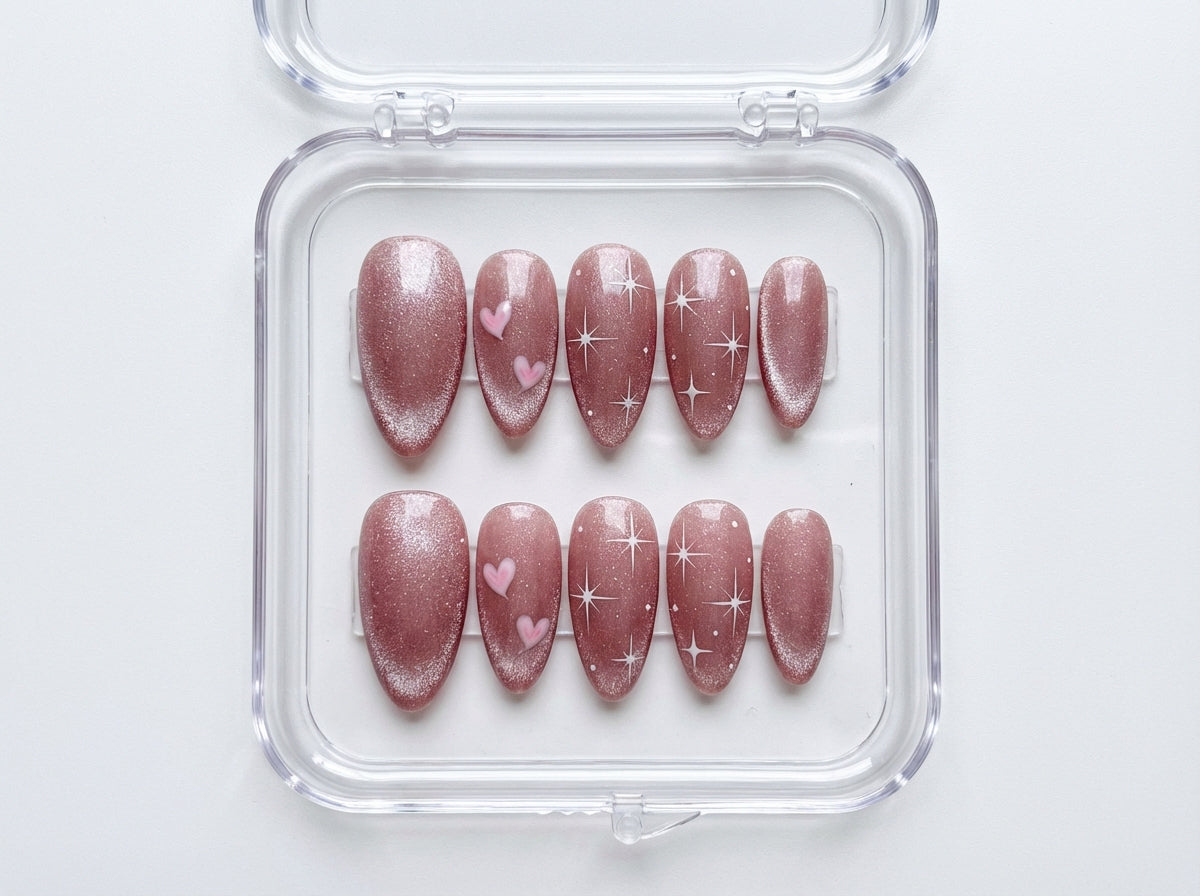 Mauve Cat Eye Press On Nails, Silver Velvet Star Nails, Pink Heart Accent Nails, Celestial Reusable Fake Nails, Luxury Glitter Almond Nails - PN251288