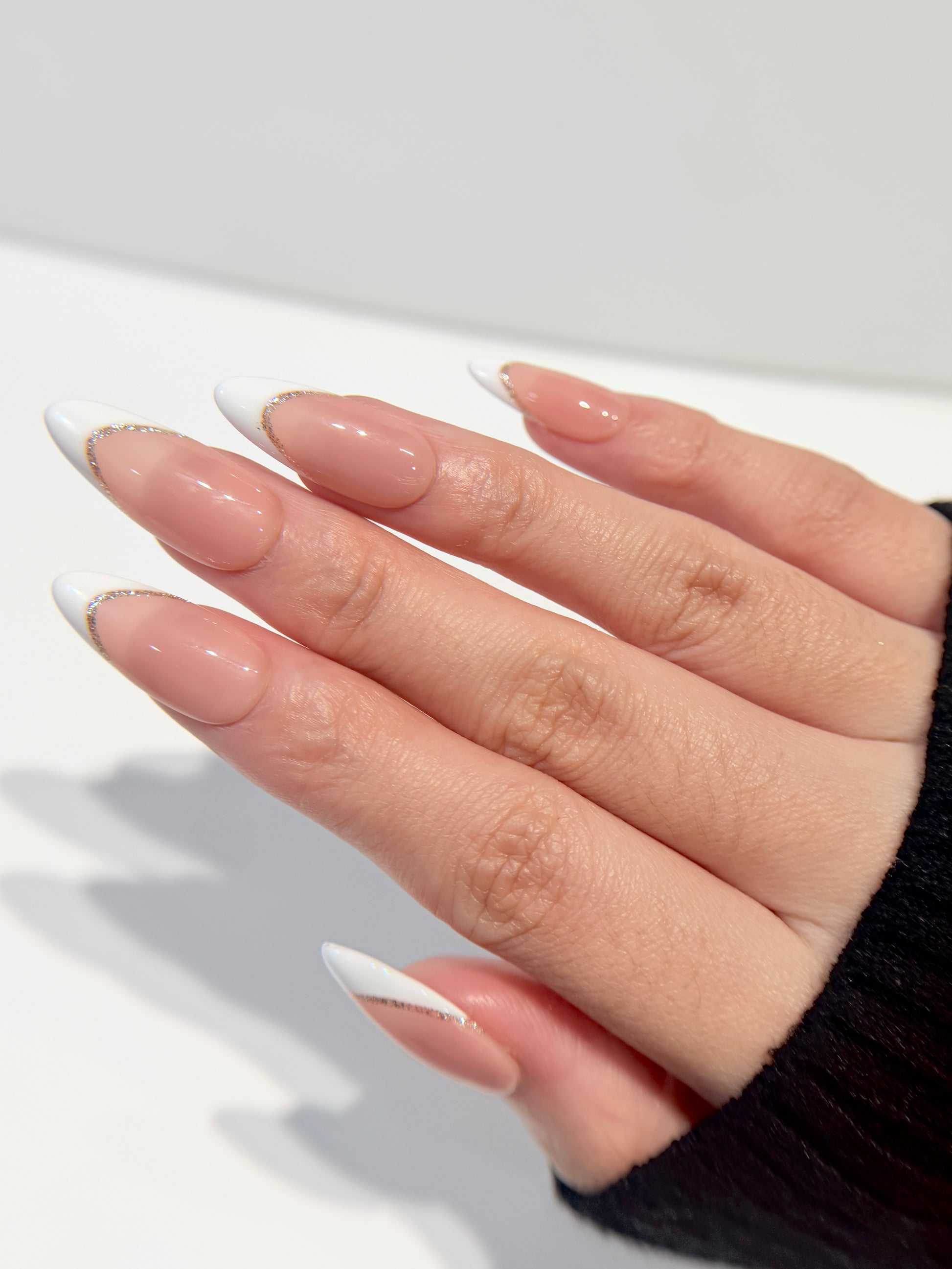 These handmade press-on nails feature a soft nude-pink base with clean white French tips in a flattering long almond shape. Each tip is outlined with a delicate silver shimmer line, adding just the right amount of elegance without overpowering the classic French look.