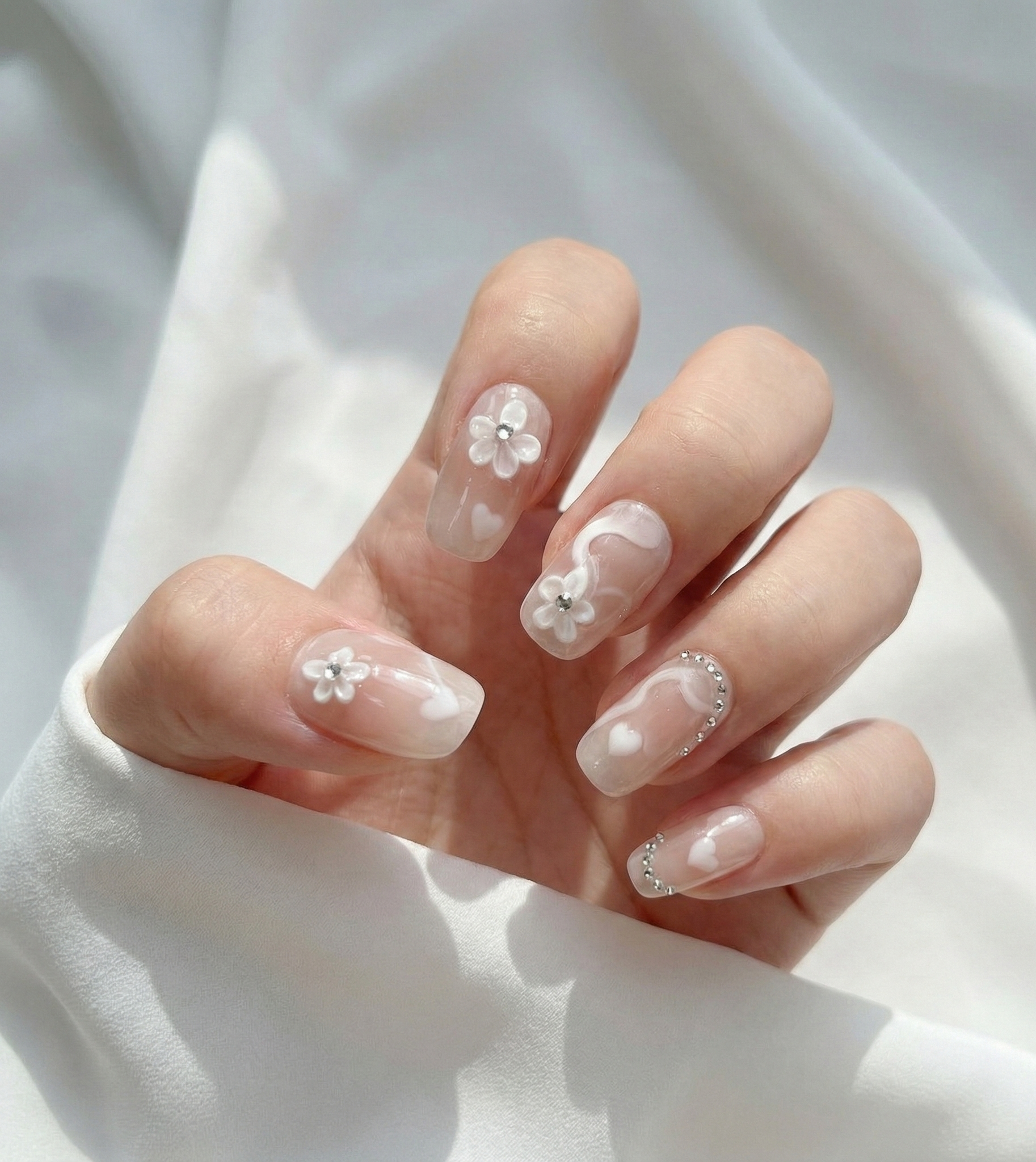 The art is purely ethereal: hand-sculpted 3D white flowers with sparkling crystal centers bloom across the nails, accompanied by hand-painted white swirls and tiny, delicate hearts. A subtle rhinestone chain accent on the pinky adds just the right amount of sparkle. These are perfect for weddings, spring dates, or completing your coquette aesthetic.
