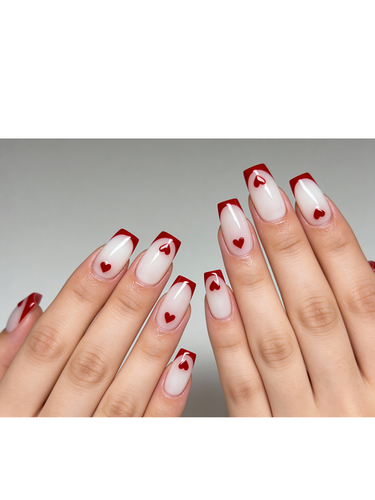 Red French Tip Press On Nails, Milk White Ombre Nails, Tiny Heart Nail Art, Romantic Square Nails, Reusable False Nails, Pinneacle Beauty - PN251289