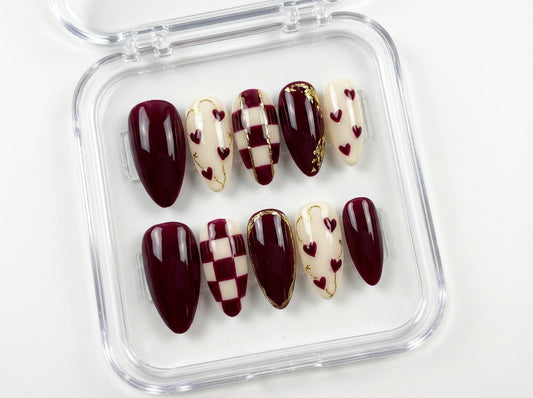 Burgundy Heart Press On Nails, Dark Red Checkered Nails, Gold Leaf Luxury Fake Nails, Deep Wine Reusable Nails, Pinneacle Nails - PN251293