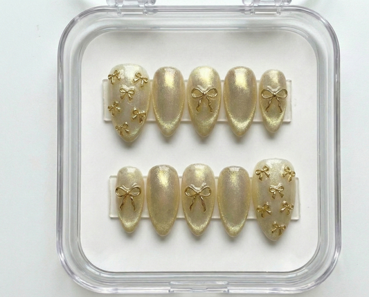 Gold Cat Eye Press on Nails, Champagne Velvet Nails, Gold Bow Charm Nails, 3D Coquette Nails, Luxury Almond Fake Nails, Elegant Shimmer Nails - PN251282