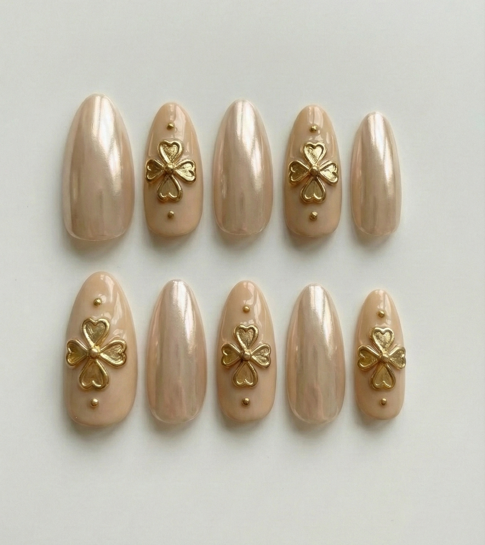 Jeweled Accents: The accent nails feature a creamy nude base adorned with a stunning, raised gold metallic four-leaf clover charm.