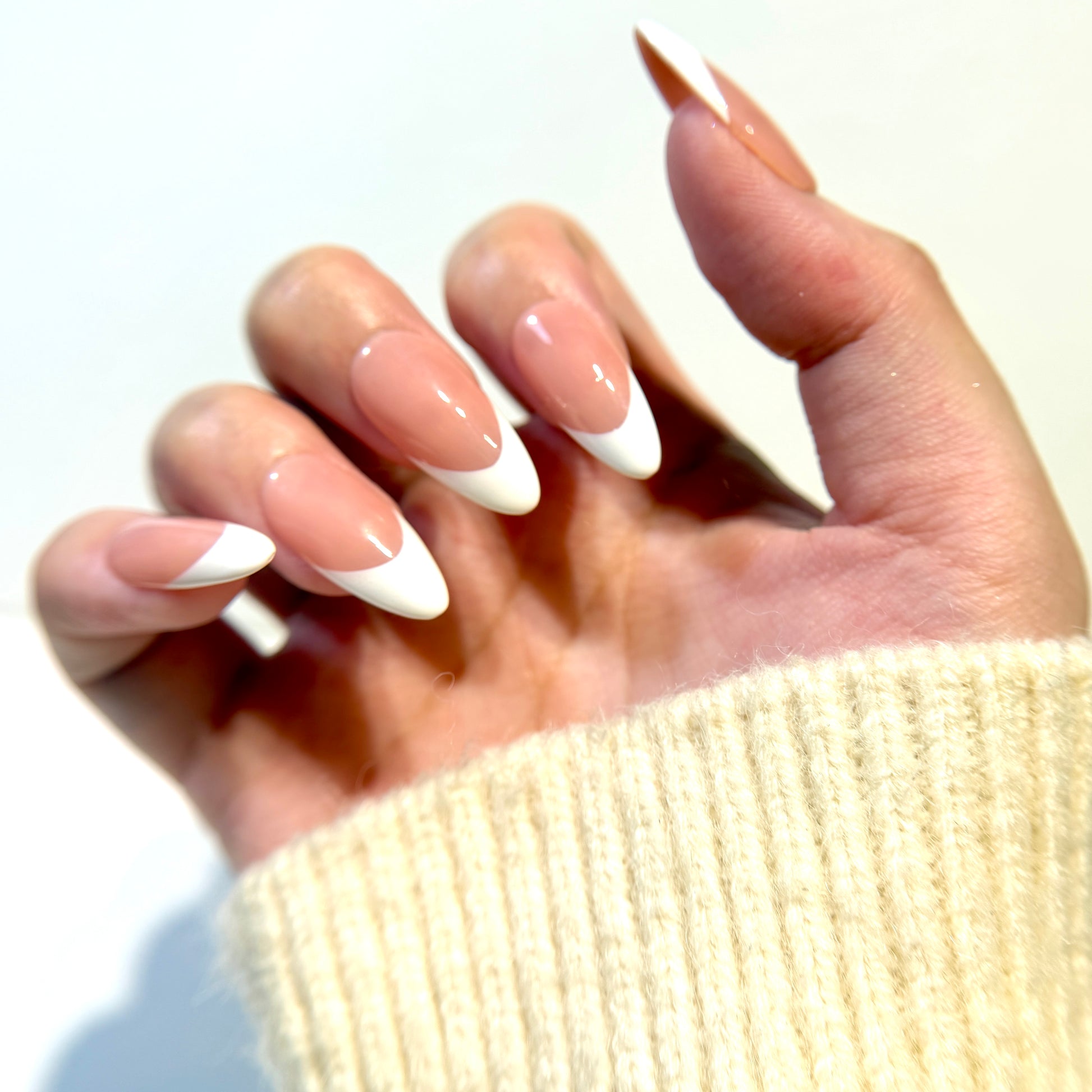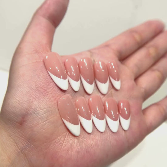 These handmade French tip press-on nails feature a soft nude-pink base paired with clean, crisp white tips in a flattering almond shape. The glossy finish gives the set a smooth, polished look that feels elegant and effortless — perfect for everyday wear, bridal looks, special events, or anyone who loves a simple and timeless nail style.