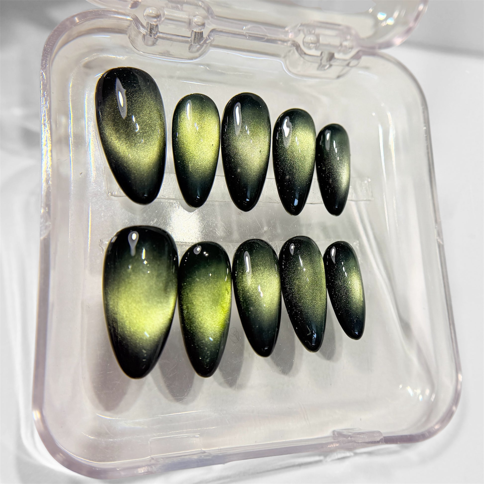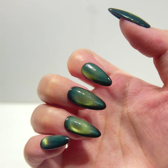 This stunning Green Cat Eye Press-On Nail Set features a deep emerald-black base with a glowing magnetic green light effect that shifts beautifully under different lighting. The rich, dimensional cat-eye finish creates a luxurious, mystical look inspired by gemstone shine and northern-light tones.