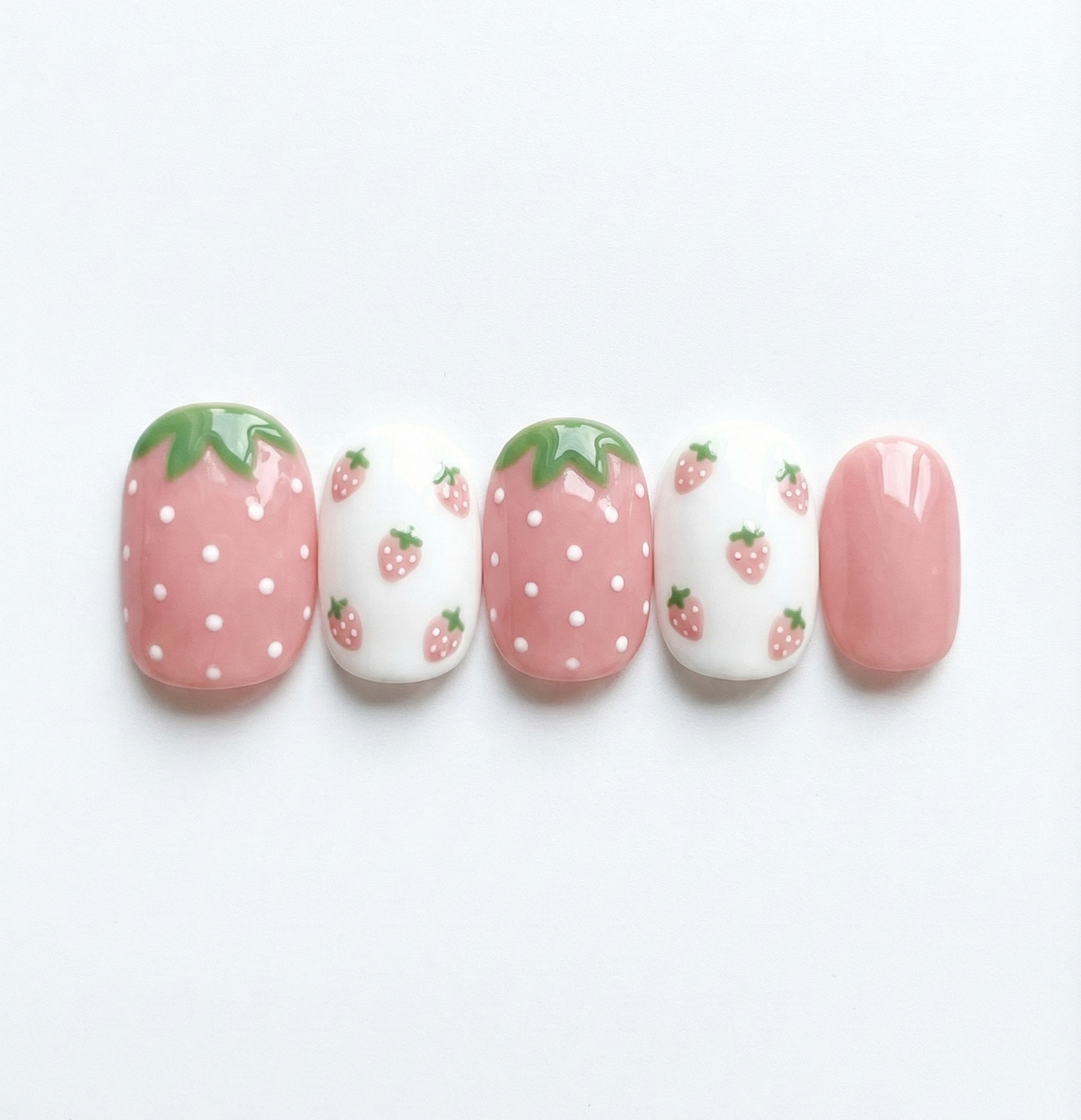 The Strawberry: A juicy pink base dotted with white seeds and topped with a hand-painted green stem at the cuticle, turning your entire nail into a strawberry.