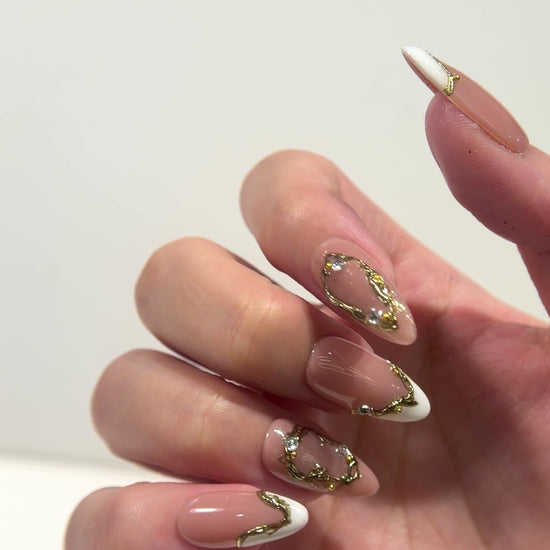 This set features a soft nude-pink base paired with delicate gold 3D metal frames and tiny crystal accents. Some nails have a subtle white tip, while others are decorated with organic, irregular gold shapes that create a handcrafted, jewelry-inspired look. The design feels elegant, artistic, and perfect for anyone who loves detailed statement nails without being too bold.