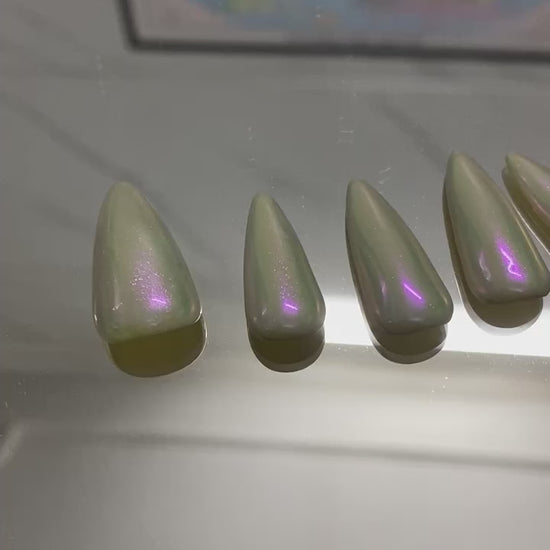 This set features a soft pearlescent chrome finish with a beautiful iridescent shift of pink, green, and gold depending on the light. The colour is subtle yet eye-catching, giving the nails a luminous, glossy glow without any extra embellishments.