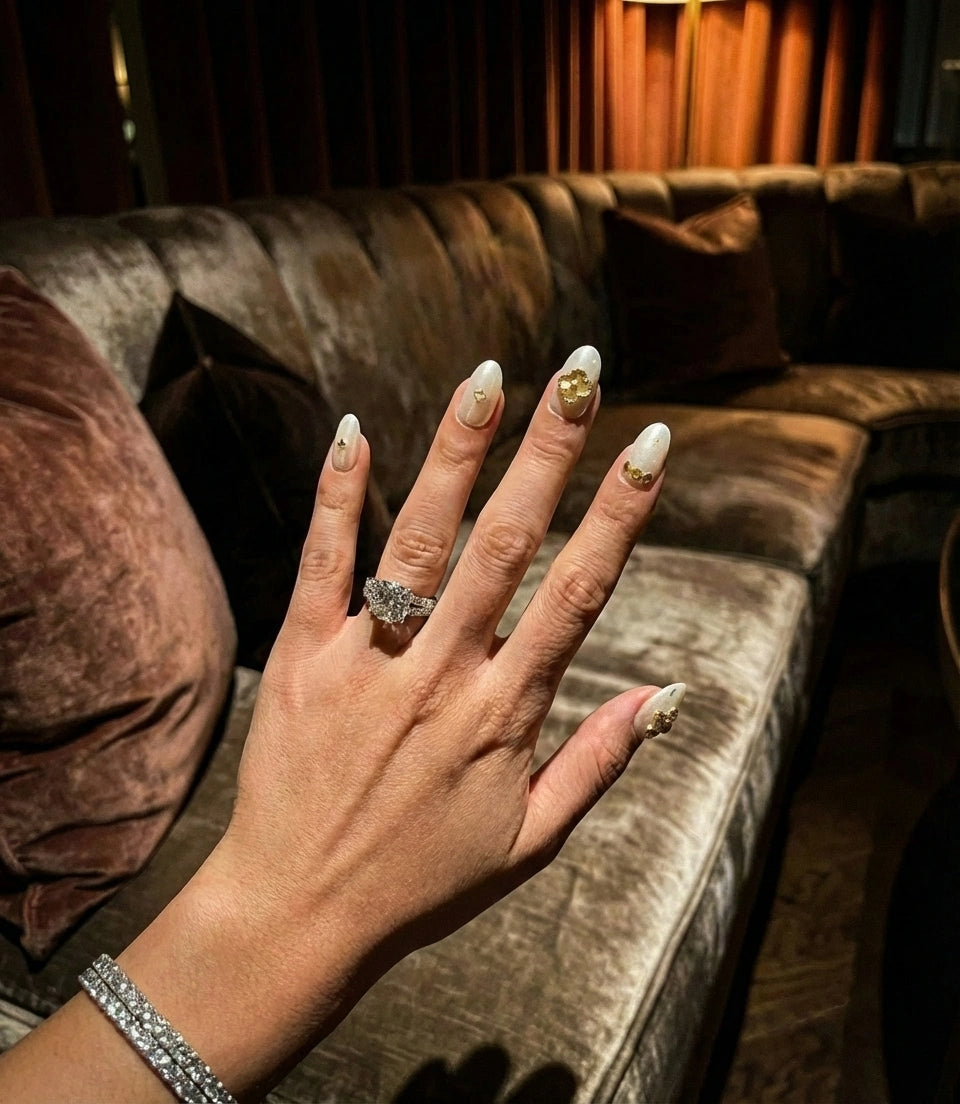 These handmade pearl white press-on nails feature a soft, luminous finish accented with delicate gold floral charms and gold flakes, creating an elegant and timeless look. The pearly sheen reflects light beautifully, giving a clean, minimalist, luxury aesthetic that’s perfect for brides, weddings, engagements, or an everyday “rich girl” style.