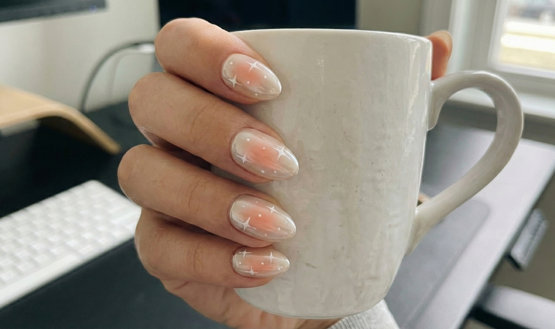 Get the viral "Angel Energy" look with the "Blushing Star" Aura Set. This ethereal design combines the hottest Korean nail trends into one soft, romantic look.