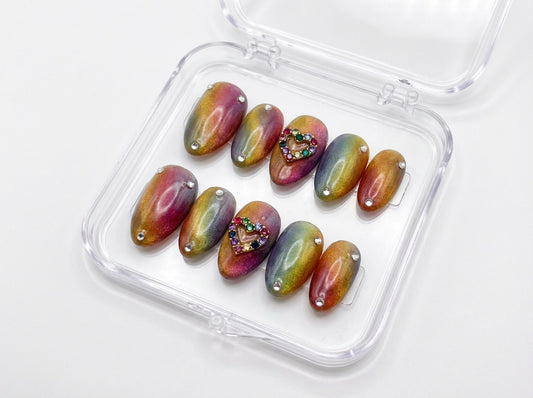 Rainbow Aura Press On Nails, Colorful Jewel Heart Fake Nails, Multi Chrome Gradient Nails, Luxury Reusable Gel Nails, Pinneacle Beauty - PN251290