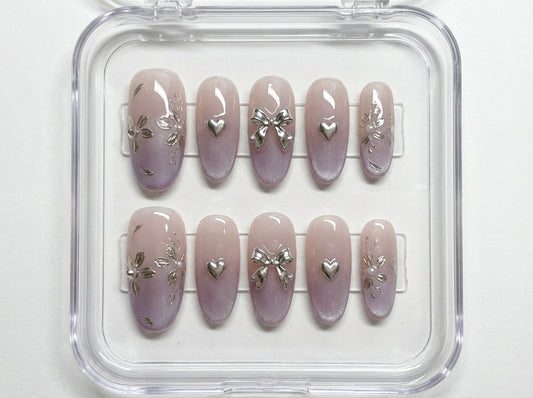 Purple Ombre Cat Eye Nails, Silver Chrome Floral Press on Nails, Coquette Bow Nails, Lavender Velvet Nails, 3D Heart Nails, Y2K Fake Nails - PN251281