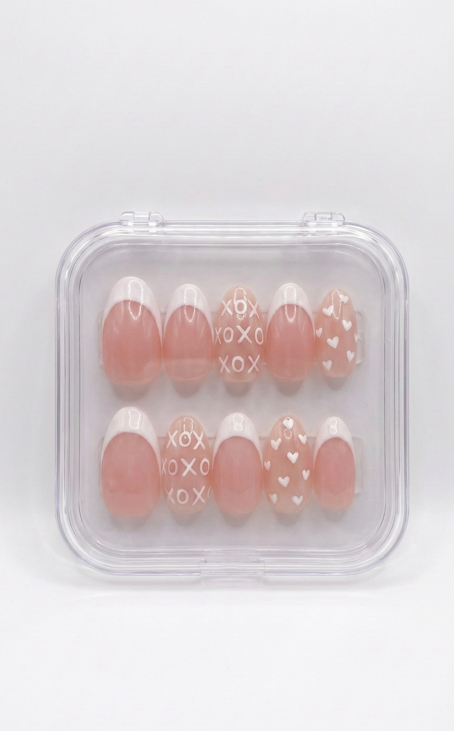 White French Tip Nails, XOXO Heart Art, Nude Almond Shape, Minimalist Valentine, Clean Girl Aesthetic, Wedding Guest, Custom Size Set - PN251268